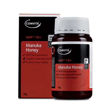 Comvita® UMF® 18+ Manuka Honey is produced in New Zealand and contains unique plant phenols naturally present at varying levels in honey made from the nectar of the Manuka bush (Leptospermum scoparium), native to New Zealand.